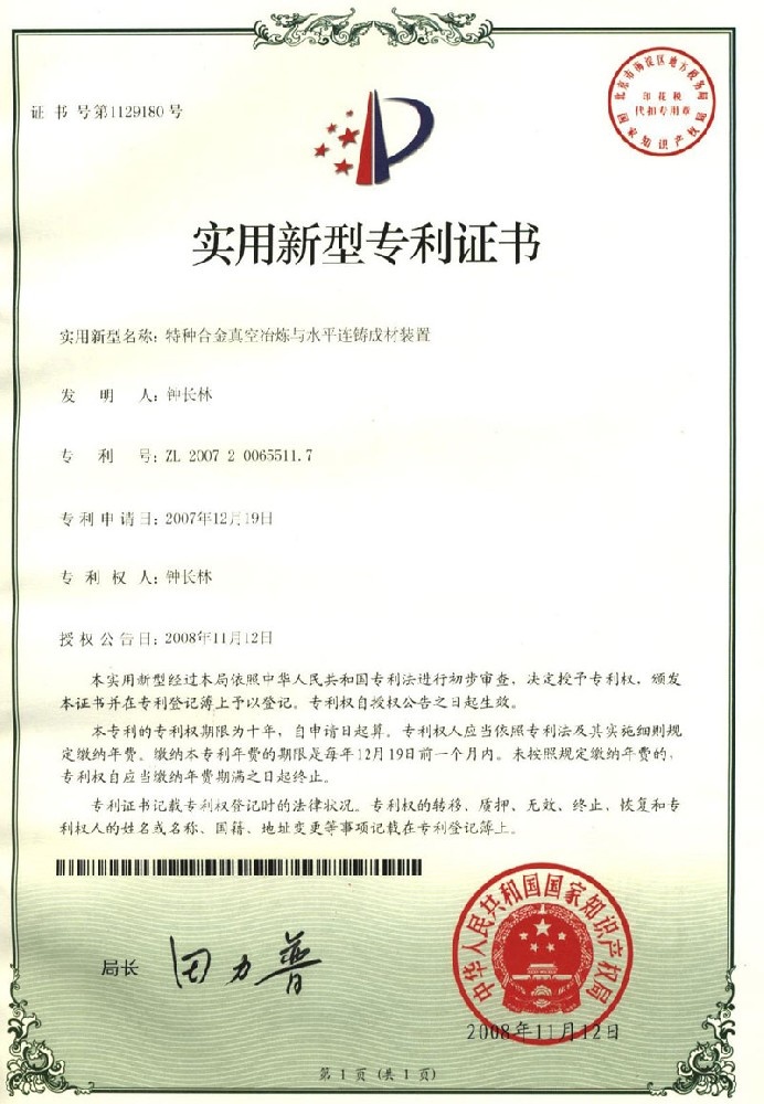 實(shí)用新型專利證書 |